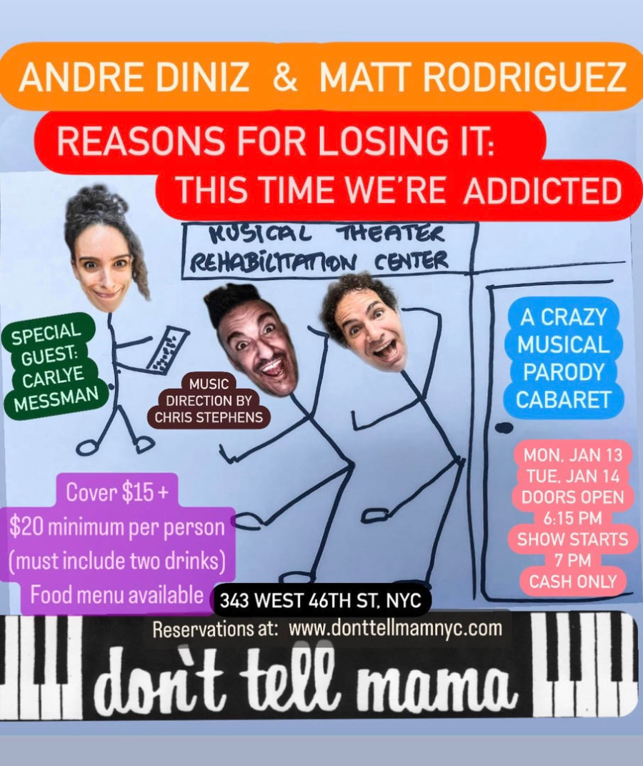 Andre Diniz & Matt Rodriguez embark on a brand-new musical parody journey exploring the many reasons NYC can make you lose it and how you can hold on to the little bit of sanity you have left. That is before it’s all gone, darlings! With special guest Carlye Messman and the piano stylings of Chris Stephens, this time they’ll dive deep into their pool of addictions hoping to come out as clean as a bootie on a date with a most toilette. Reserve your tickets now:
